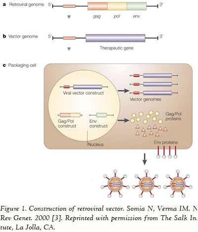 There are advantages and disadvantages to all of the currently available vectors; the suitability of the vector, therefore, actually depends on the disease or condition that is being treated. For instance, if the goal of the gene therapy is to increase bone marrow engraftment with the transient expression of a growth factor, the use of chemical transfection or naked DNA transfer methods would suffice. However, if the objective is to provide long-term treatment for an inherited disease, then the use of an integrating viral vector is more desirable. Thus, a vector that might be ideal for treating one defect may not be ideal for another. Driven by the desire to develop the “perfect” vector, scientists are continually striving for novel forms of gene delivery that might become the “magic bullet.” Somia and Verma [3] have proposed that the ideal gene therapy vector should include all of the following properties: 1) easy production at a high titer on a commercial scale with a reasonable shelf-life for transport and distribution 2) sustained or regulated expression of the transgene product that is adjustable to the nature of the disease, 3) absence of immune response against the vector and the transgene product, 4) ability to target specific tissues and/or cell types while avoiding professional antigen-presenting cells, 5) absence of size limitations for the genetic material to be delivered by the vector, 6) site-specific integration of the transgene into the chromosome of the target cell to avoid insertional mutagenesis, or faithful division and segregation if it is to reside in the nucleus as an episome independent of local chromatin environments, and 7) an ability to infect dividing and post-mitotic cells. Unfortunately, none of the currently available gene delivery vectors carry all of these features; however, many vectors have enough of the attributes to make them promising for clinical use.